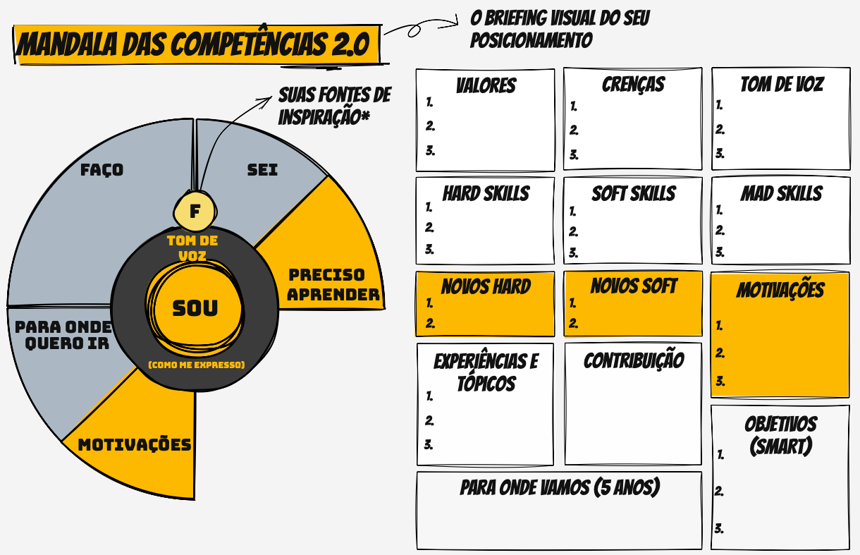 É aqui que entra a mandala das competências, um framework que desenvolvi ao longo de quase 20 anos trabalhando com marketing e conteúdo. Ela não é só um exercício visual. É como colocar um espelho na sua frente, e, pela primeira vez, enxergar um mapa do que você já tem e do que ainda pode cultivar.