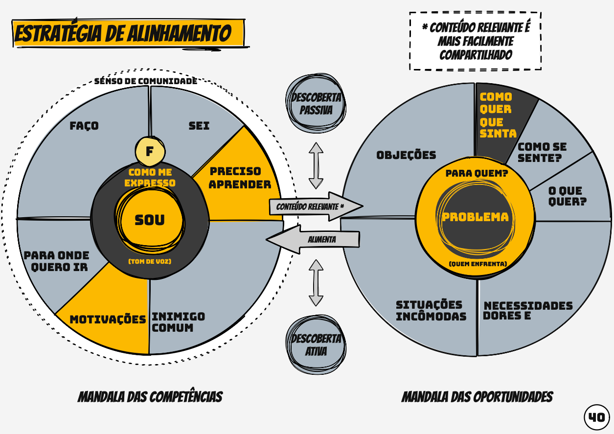 De um lado, a Mandala das Competências. Representa o que você é, sabe, faz e quer aprender; do outro, a Mandala das Oportunidades. Resume o que o público sente, precisa e quer resolver com sua ajuda.